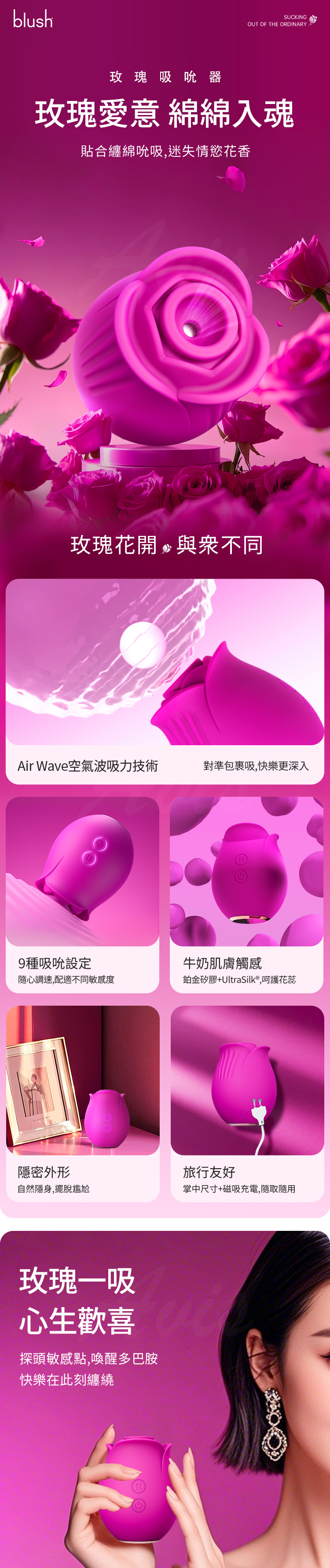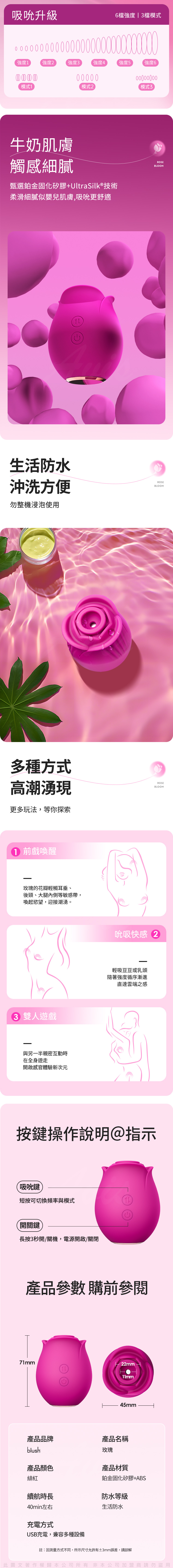 品名:Blush|玫瑰悸動|吸吮器 桃紅顏色:緋紅續航時長:40min左右充電方式:USB充電,兼容多種設備
